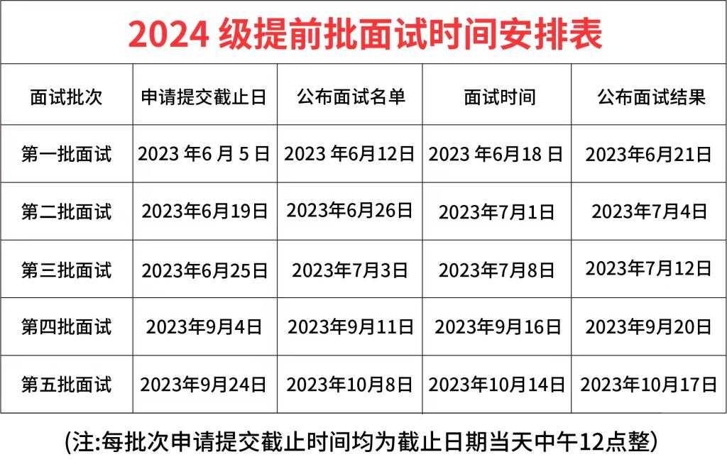2. 每批次申請(qǐng)截止時(shí)間均為截止日當(dāng)天中午12點(diǎn)整,臨近截止日時(shí)提交申請(qǐng)考生數(shù)可能較多,可能因訪問(wèn)量過(guò)大造成網(wǎng)站擁堵或其他無(wú)法預(yù)知狀況而耽誤考生的申請(qǐng),建議考生盡早提交申請(qǐng)資料。逾期只能改為申請(qǐng)其他未截止的面試批次。每位考生每年只能申請(qǐng)一次提前批面試,如未獲得面試資格、面試未通過(guò)或缺考,本年度不能再次申請(qǐng)?zhí)崆芭嬖嚒?br />
