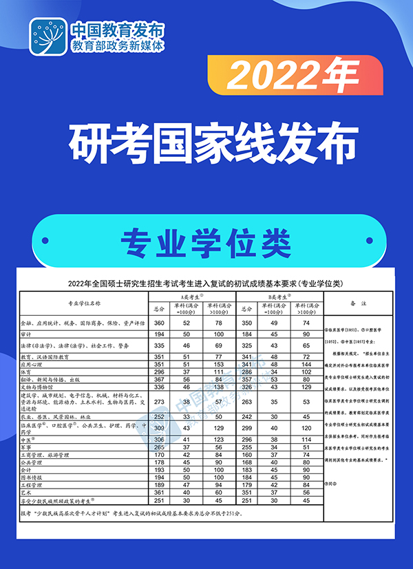 同日,教育部發(fā)布了《2022年全國(guó)碩士研究生招生考試考生進(jìn)入復(fù)試的初試成績(jī)基本要求》(國(guó)家分?jǐn)?shù)線)。各招生單位將根據(jù)《2022年全國(guó)碩士研究生招生工作管理規(guī)定》,在國(guó)家分?jǐn)?shù)線的基礎(chǔ)上,自主確定并公布本單位各專業(yè)考生進(jìn)入復(fù)試的要求。