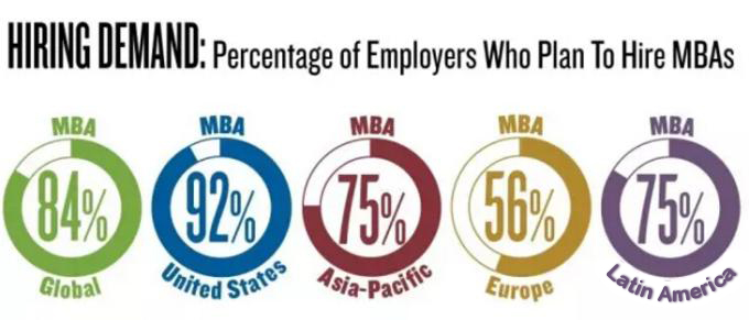 調(diào)查顯示,2015年雇主對(duì)商學(xué)院畢業(yè)生的需求繼續(xù)呈現(xiàn)強(qiáng)勁的上升趨勢,全球有84%的企業(yè)計(jì)劃招聘MBA畢業(yè)生,而這一比例在2014年為74%,五年前僅為62%。同時(shí),全球各地區(qū)對(duì)MBA畢業(yè)生的需求也有較大差異。