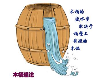 該理論由美國管理學(xué)家彼得提出:盛水的木桶是由許多塊木板箍成的,盛水量也是由這些木板共同決定的。若其中一塊木板很短,則盛水量就被短板所限制。這塊短板就成了木桶盛水量的“限制因素”。