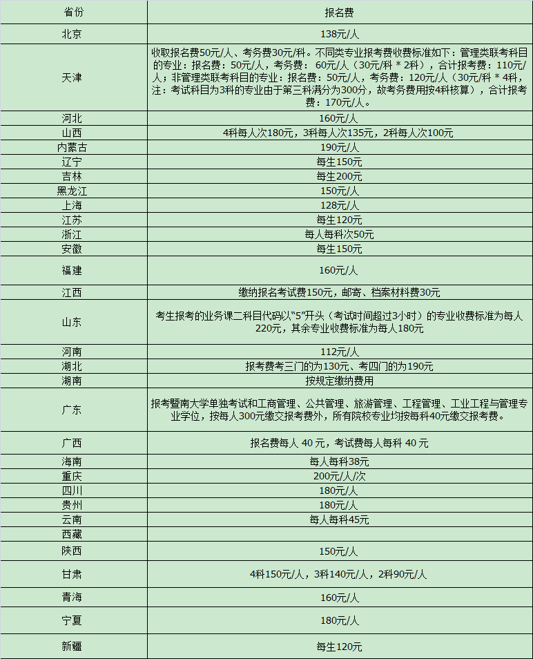 2020年全國(guó)各省市考研報(bào)名費(fèi)