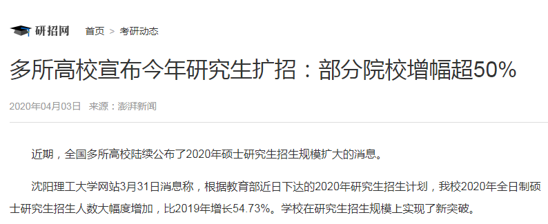 就在這樣不景氣的階段里,研招網(wǎng)發(fā)布了研究生擴(kuò)招近50%的消息打破了大學(xué)生和在職人員的焦慮,讓很多迷茫的看到了機(jī)會(huì)。