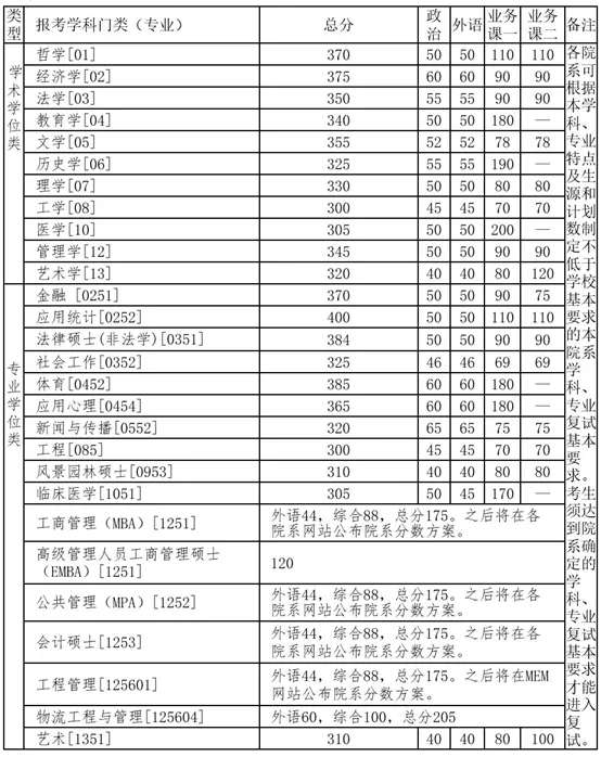 (2)“少數(shù)民族高層次骨干人才計劃”(不含新疆MPA項目):同時滿足滿分100分科目單科成績不低于40分;滿分150分科目單科成績不低于70分;滿分200分科目單科成績不低于107分;滿分300分科目單科成績不低于140分;總分滿分300分考生總分不低于195分;總分滿分500分考生中,理工醫(yī)考生(報考專業(yè)代碼前兩位為“07”、“08”或“10”)要求總分不低于270分,非理工醫(yī)考生總分不低于320分。或者依據(jù)所報考院系(專業(yè))復(fù)試分?jǐn)?shù)線,總分線降10分,單科線不降。兩項分?jǐn)?shù)政策不可同時享受。