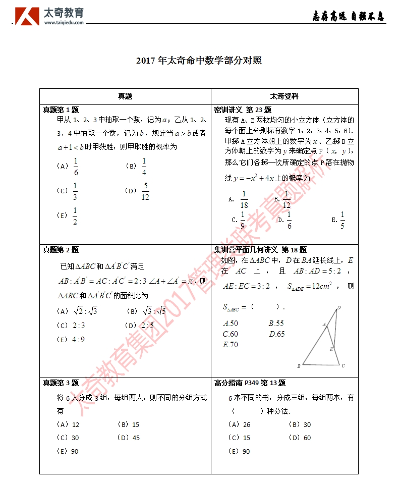 祝賀太奇教育2017管理類聯(lián)考數(shù)學(xué)直接命中66分