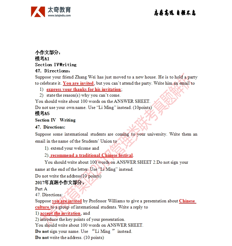 祝賀太奇教育2017管理類聯(lián)考英語大小作文直接命