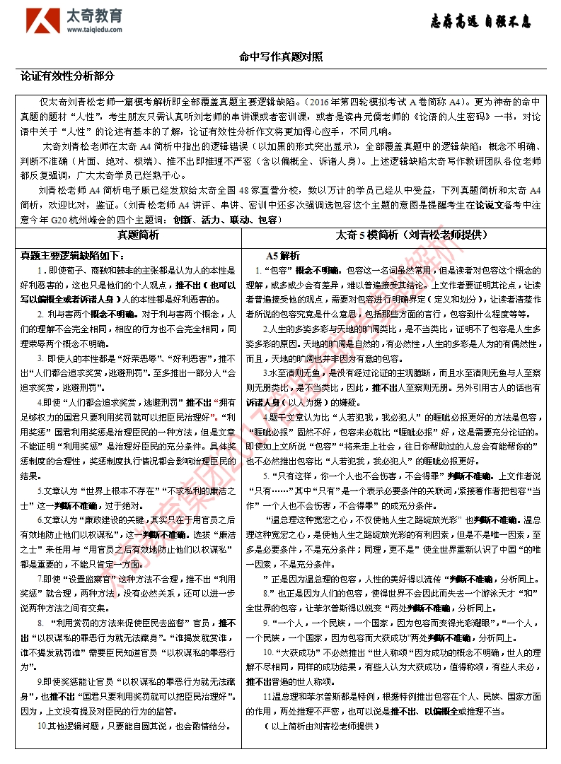 在2017年MBA管理類聯(lián)考中,綜合寫作考試部分全部命中,比命中考題更為重要的是:太奇在對(duì)每次??嫉闹R(shí)點(diǎn)、考點(diǎn),尤其在對(duì)命題方向的把握上極其精準(zhǔn)。