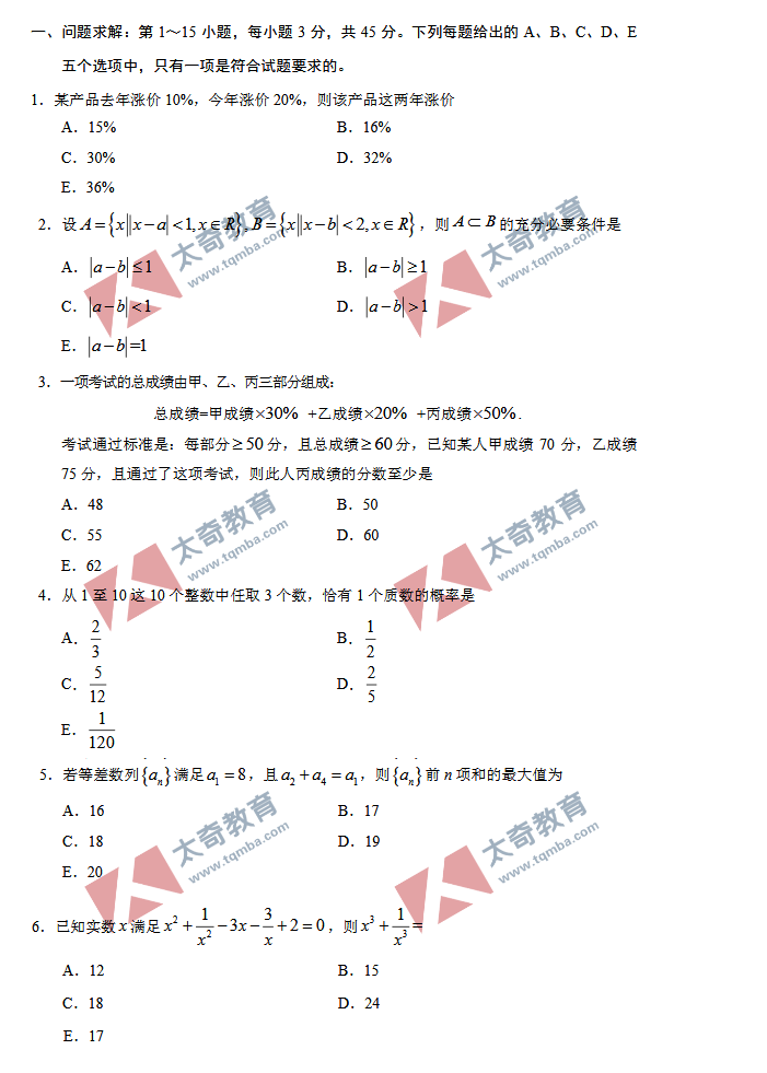 管理類碩士官方備考群,考生互動,擇校評估,真題討論 點擊加入備考群>>2020年管理類聯(lián)考考試試題及答案公布,內(nèi)容整理如下,供參考。【太奇教育名師管理類聯(lián)考真題解析及在線估分】12月21日19:00準時在線直播>>真題解析、考情分析、在線估分、復試前瞻、調(diào)劑攻略,敬請關(guān)注!太奇教育小編也祝同學們考得好成績。