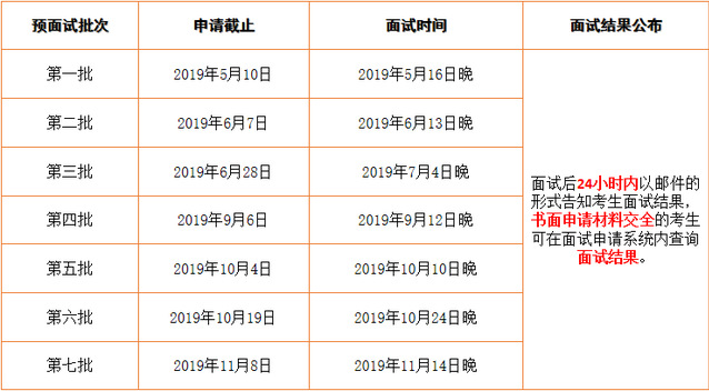 面試安排批次依照考生遞交書面材料的順序先到者先評估,先安排預(yù)面試。預(yù)面試內(nèi)容:綜合能力面試(個(gè)面)、英語能力測試(6到8人一組面試)。面試后我校會在系統(tǒng)中告知考生的面試成績,即錄取分?jǐn)?shù)線類別(A線B線C線)。報(bào)考我校一志愿的考生成績兩年有效,次年可繼續(xù)申請。