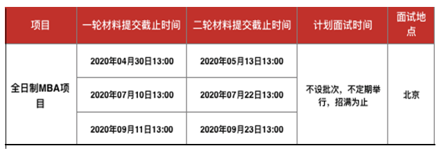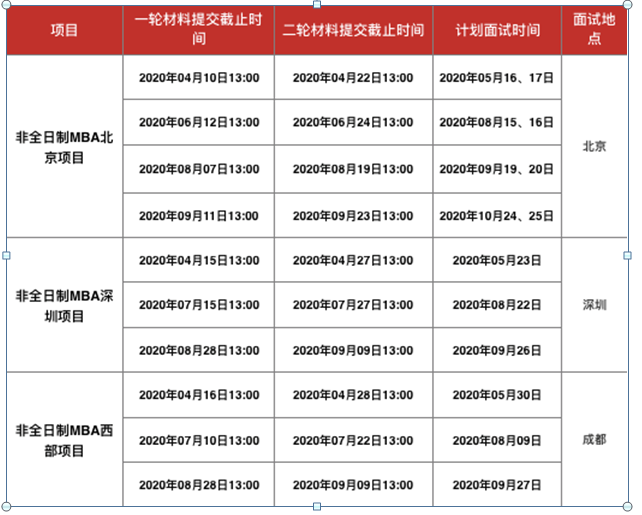非全日制項(xiàng)目:非全日制MBA北京項(xiàng)目的一輪材料提交deadline為2020年09月11日13:00,二輪材料提交deadline為2020年09月23日13:00;此項(xiàng)目還包括深圳、西部項(xiàng)目招生。