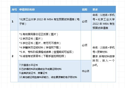 2.申請材料:請將《北京工業(yè)大學(xué)2022年MBA考生預(yù)面試申請表》和資審材料放入同一文件夾(見原文鏈接附件),壓縮打包后發(fā)送,郵件名稱和文件夾名稱為“第x批2022MBA預(yù)面試+姓名+手機號”。