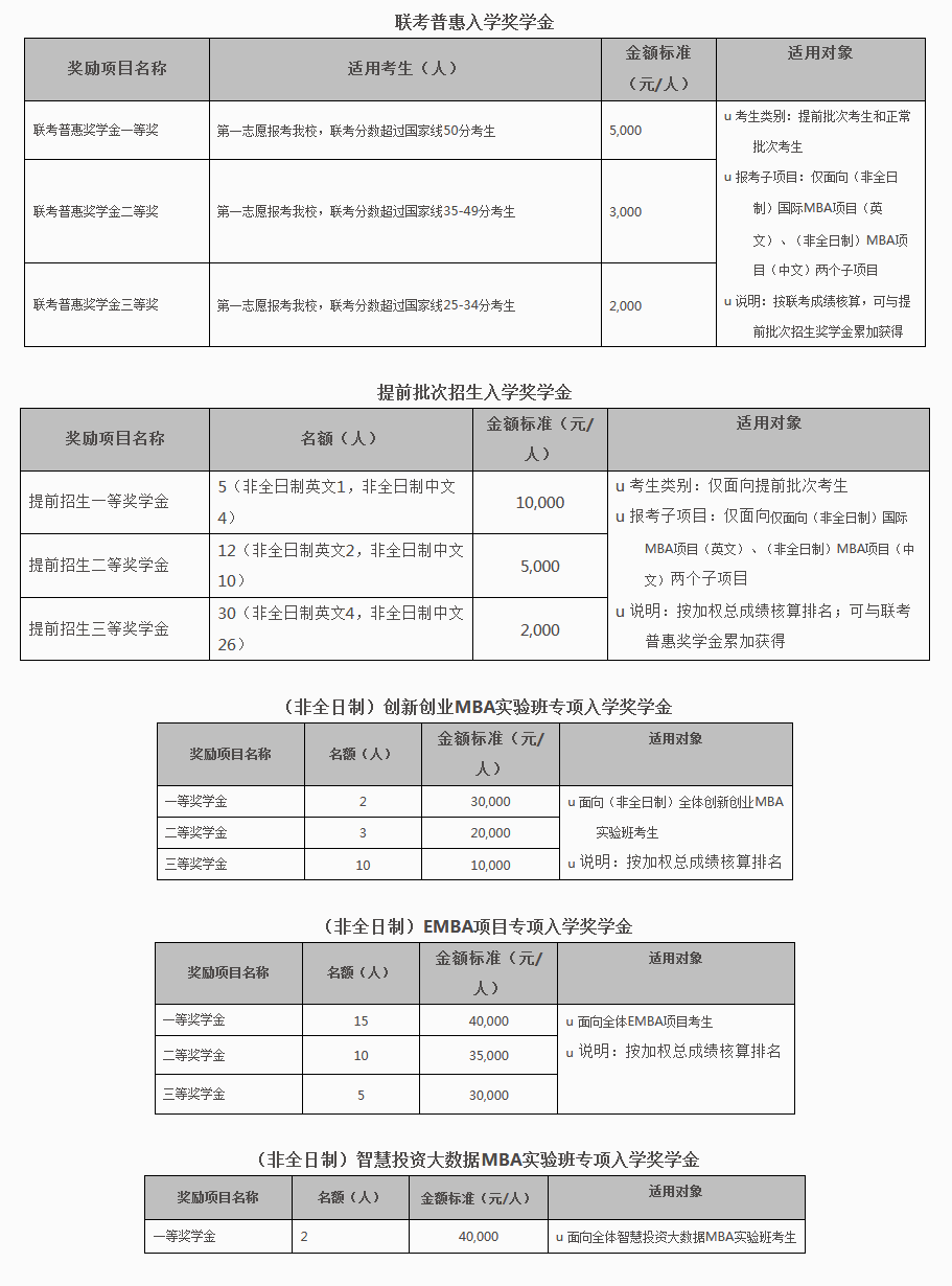 設(shè)立五種類(lèi)別入學(xué)獎(jiǎng)學(xué)金,以資鼓勵(lì)報(bào)考我校MBA/EMBA項(xiàng)目、全國(guó)聯(lián)考初試分?jǐn)?shù)成績(jī)優(yōu)秀、提前批次招生面試表現(xiàn)出色的考生。