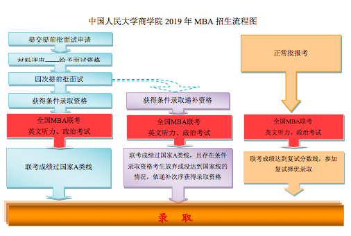 登錄中國人民大學(xué)商學(xué)院MBA項(xiàng)目中心網(wǎng)站“考生服務(wù)系統(tǒng)”,按照規(guī)定時間提交網(wǎng)上申請材料,學(xué)院將組織專家評審申請材料,擇優(yōu)給予提前面試資格并組織面試。面試后獲得條件錄取資格和條件錄取遞補(bǔ)資格的考生需參加2018年12月底舉行的全國聯(lián)考。