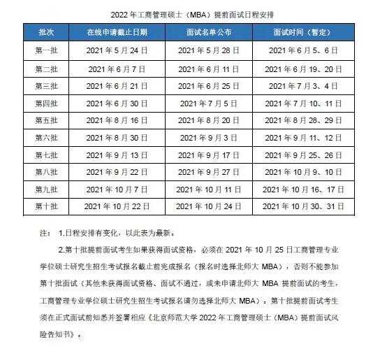 因2022年全國碩士研究生招生考試網(wǎng)上報名時間較往年有提前,北師大2022年MBA的提前面試批次及時間安排做出調(diào)整,最新見下圖及說明。