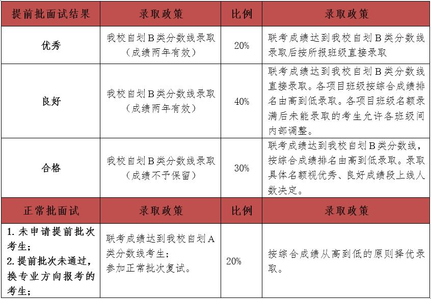 2.提前面試中獲得有條件預(yù)錄?。▋?yōu)秀、良好、合格)資格的考生聯(lián)考成績過我校自劃B類分數(shù)線且在檔案和申請材料審查真實性通過后,按成績對應(yīng)錄取政策錄??;