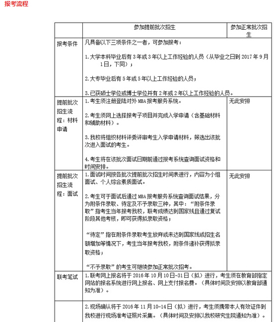4. “MBA提前批次招生”將安排于2016年5月至11月進(jìn)行,參加提前批次招生的考生需在聯(lián)考報(bào)名前的指定期間內(nèi)在線提交申請材料,經(jīng)過材料評審,擇優(yōu)給予面試資格;經(jīng)過面試給予綜合素質(zhì)優(yōu)秀的考生“附條件錄取”資格;原則上,該類考生參加全國聯(lián)考成績達(dá)到國家A線即可錄取。