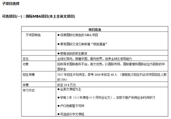 1. 招生類別分為兩個子項(xiàng)目:國際MBA項(xiàng)目(本土全英文)、在職MBA項(xiàng)目。兩個項(xiàng)目設(shè)置獨(dú)立的招生標(biāo)準(zhǔn),分別招生,在簡歷評審、面試選拔等環(huán)節(jié)各自排序。申請任意子項(xiàng)目并獲得附條件錄取資格后,原則上不做任何項(xiàng)目調(diào)整。
