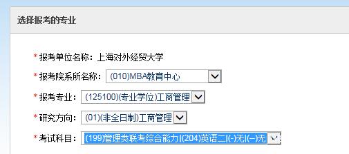 5、選擇報(bào)考專(zhuān)業(yè),請(qǐng)一定按以下信息填寫(xiě)(研究方向)請(qǐng)按所報(bào)項(xiàng)目進(jìn)行選擇,此處僅以在非全日制MBA為例: