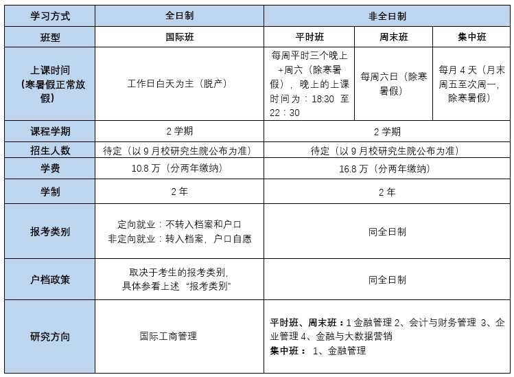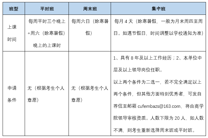 答:非全日制考生在提前批面試階段選擇的班型僅為初步意向??忌稍跀M錄取結(jié)果公示后,即2020年4月中下旬,在中財MBA招生系統(tǒng)中最終確認(rèn)班型。各班型上課時間及申請條件如下圖: