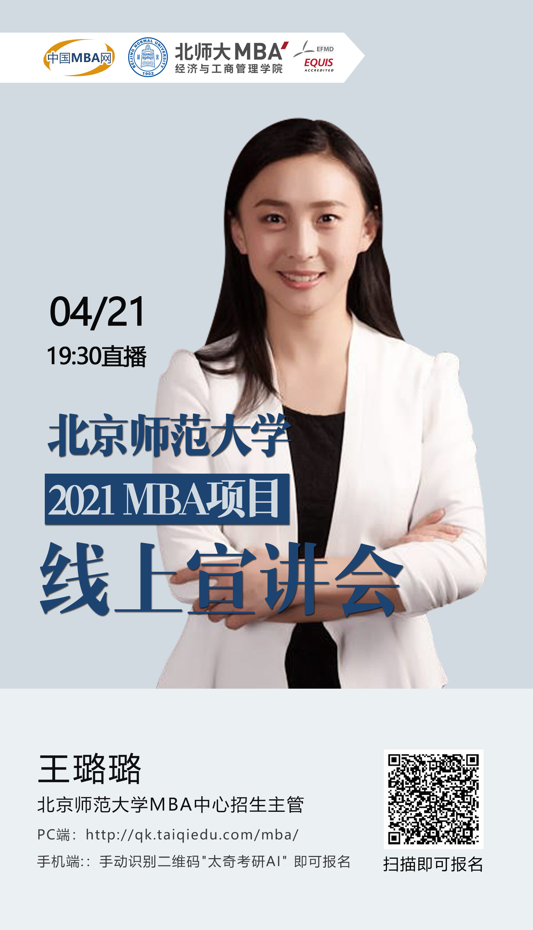 為了讓2021級考生能夠及時的了解我校2021年的招生政策及動態(tài),北京師范大學(xué)MBA項目應(yīng)中國MBA網(wǎng)的邀請出席“2021全國商學(xué)院MBA/EMBA/MEM教育巡展暨招生政策發(fā)布會”.本次宣講會將以在線直播的形式為同學(xué)答疑解惑,歡迎廣大報考我校的同學(xué)積極報名參加,期待與你們線上直播互動!