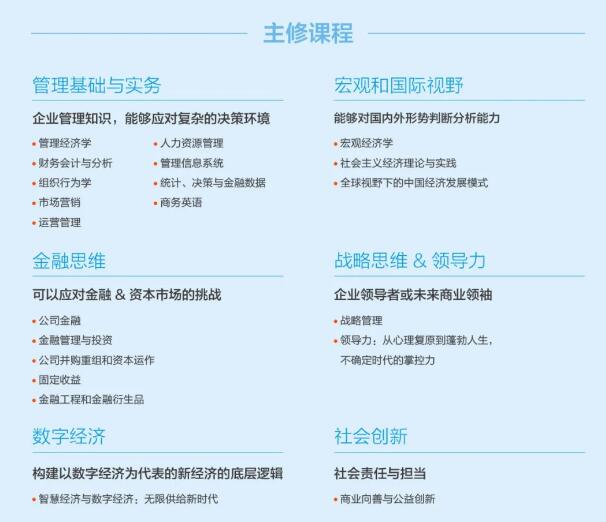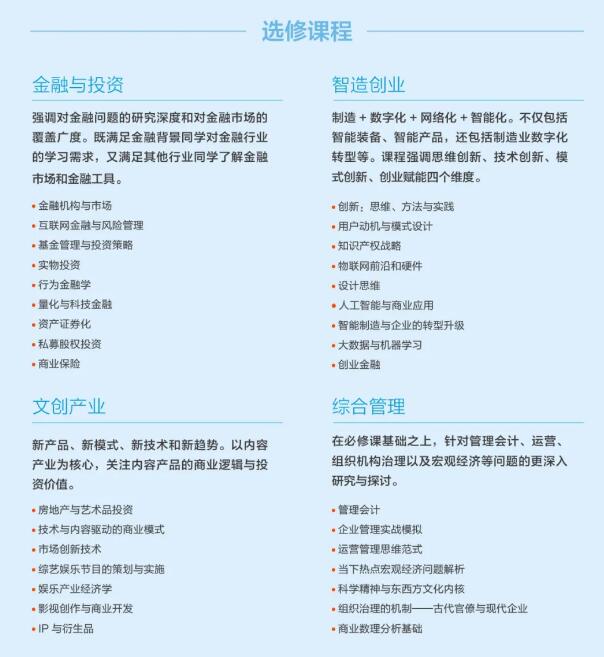 長江商學(xué)院MBA項(xiàng)目結(jié)合學(xué)院的差異化優(yōu)勢,在基礎(chǔ)核心課程之外,還圍繞金融與投資、智造創(chuàng)業(yè)、文創(chuàng)產(chǎn)業(yè)三個(gè)最具潛力的賽道以及綜合管理方向, 開設(shè)了豐富的選修課程,并通過多樣的行業(yè)實(shí)踐課程使同學(xué)保持對行業(yè)前沿趨勢的敏銳度,通過特色的海外課程提高同學(xué)的視野、實(shí)現(xiàn)資源跨界整合, 用多元的行業(yè) 講座和實(shí)景案例課堂給學(xué)生提供更充實(shí)的學(xué)習(xí)體驗(yàn)。