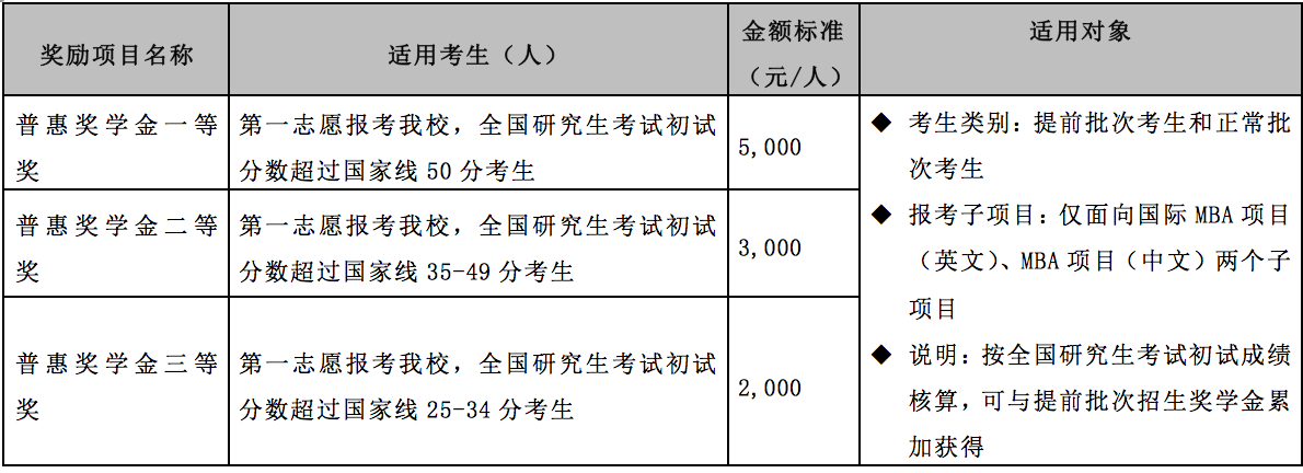 設(shè)立四種類(lèi)別入學(xué)獎(jiǎng)學(xué)金,以資鼓勵(lì)報(bào)考我校MBA/EMBA項(xiàng)目、全國(guó)研究生考試初試分?jǐn)?shù)成績(jī)優(yōu)秀、提前批次招生面試表現(xiàn)出色的考生。