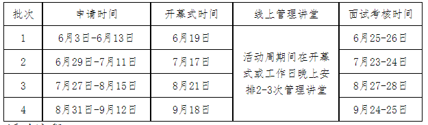 3.“MBA優(yōu)選計劃”活動分四批次進行。每批次資格審核通過的考生須通過MBA教育中心網(wǎng)站查看當(dāng)次活動通知,并按通知要求參加各項活動。