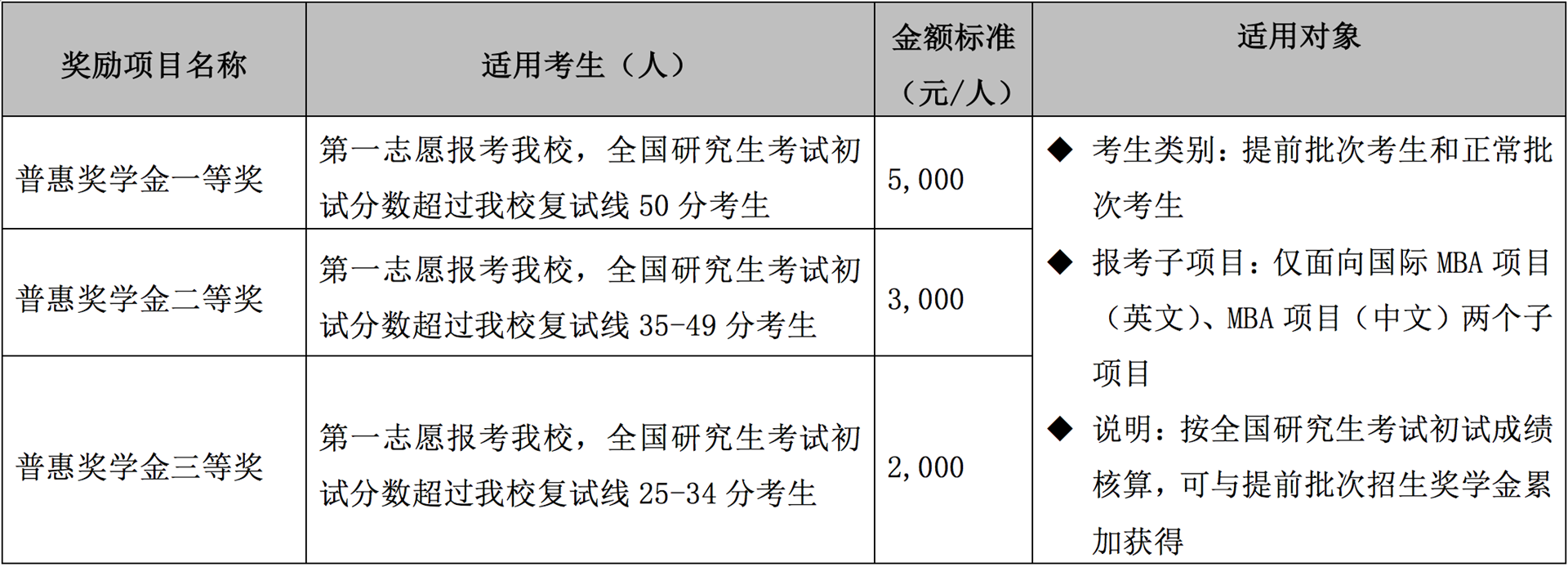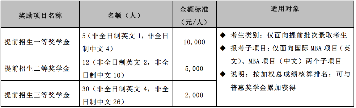 設(shè)立四種類別入學獎學金,以資鼓勵報考我校MBA/EMBA項目、全國研究生考試初試分數(shù)成績優(yōu)秀、提前批次招生面試表現(xiàn)出色的考生。