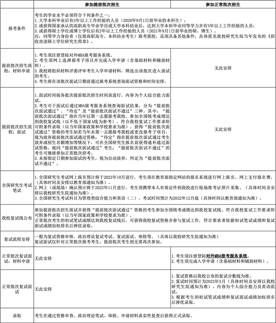 4.“MBA提前批次招生”將安排于2023年6月至10月進行,參加提前批次招生的考生須在全國研究生考試報名前的指定期間內(nèi)在線提交申請材料,經(jīng)過材料評審,擇優(yōu)給予面試資格;經(jīng)過面試環(huán)節(jié)擇優(yōu)給予綜合素質(zhì)優(yōu)秀的考生“提前批次面試通過”資格;原則上,參加提前批次招生面試并獲得“提前批次面試通過”資格的考生參加全國統(tǒng)考成績達到我校復(fù)試線(以不低于國家A線為參考),符合我校復(fù)試工作要求即可附條件錄?。ㄒ援斈陣艺吆蛯W校要求為準)。獲得“提前批次面試通過”資格的考生如若當年未第一志愿報考我?;蚋膱罂甲禹椖?,視為放棄提前批次面試通過資格。