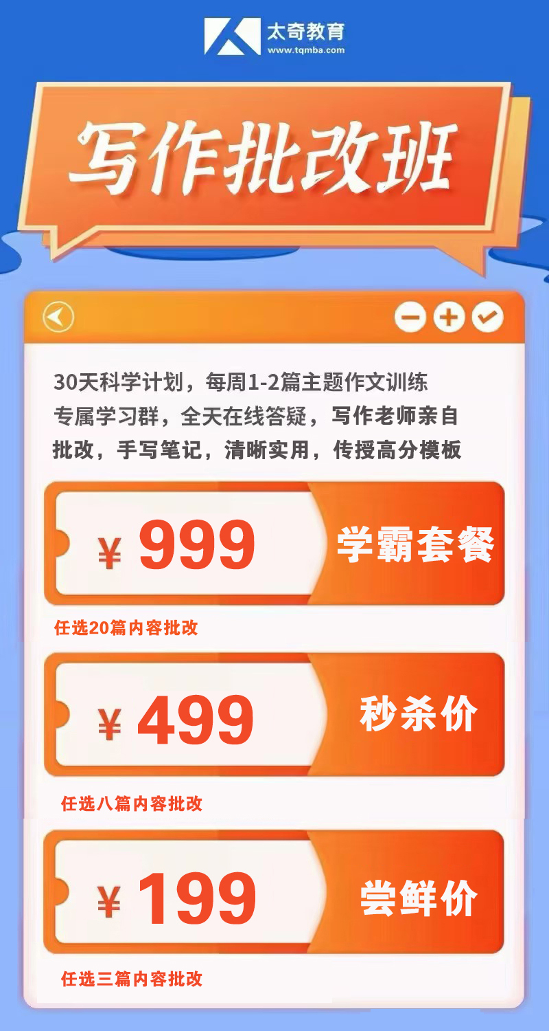 太奇寫作批改班也同步上線,為考生最大化??际找妫仄刚埗辔粚I(yè)寫作老師判卷,1V1精講,需要的同學(xué)請咨詢太奇老師